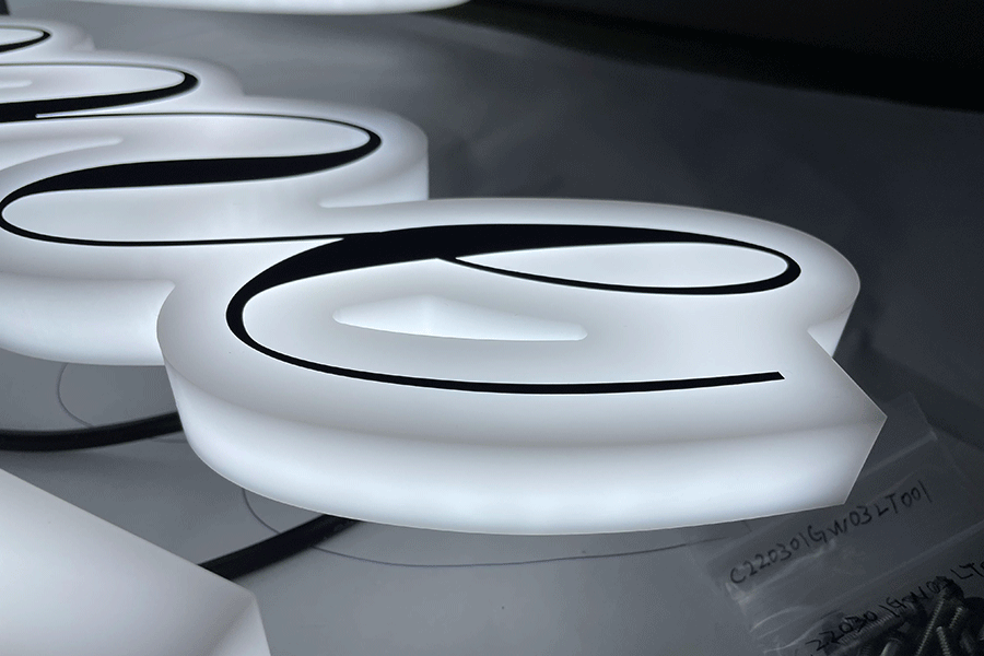 2,迷你發(fā)光字發(fā)光標識設計制作以高密度 LED 配合亞克力漫反射,正面 / 側面可同步發(fā)光,無暗區(qū)、無光